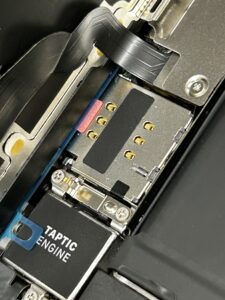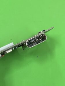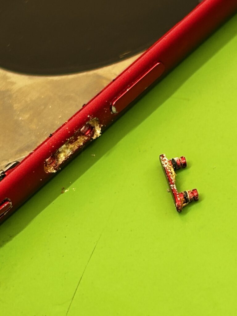 写真のiPhoneはボタンが陥没して反応しないと相談がありました。分解してみると、こんな状況で固まっていたことがわかりました。よくあることではありませんが、年に何回かはある症状です。今回はなにかの液体がボタンの中に侵入したようで、ボタンの内部まで侵入していました。